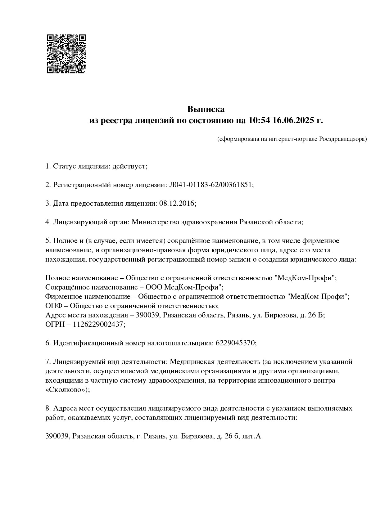 Медицинские услуги оказываются Партнером (ООО «МЕДКОМ-ПРОФИ» номер лицензии Л041-01183-62/00361851, дата выдачи лицензии: 08 декабря 2016 г.)